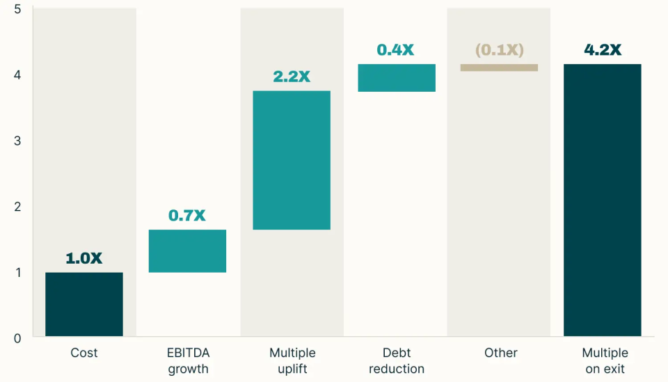- A large strategic multiple uplift accounts for most of the value creation and was achieved through positioning the company to be an attractive acquisition target for a large trade buyer.