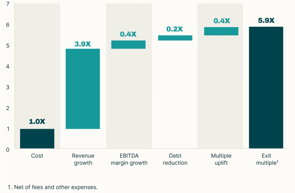 - Organic growth of 27% and 31% CAGR in terms of revenue and EBITDA over the five-year holding period.